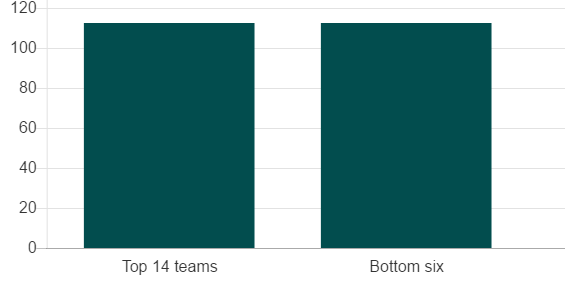 Сравнение трат на трансферы первых 14 и последних 6 команд (да, они равны — по 112,5 млн фунтов)