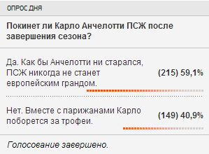 Главный тренер ПСЖ Карло Анчелотти не стал делать трагедии из ничьей с Валенсьенном, а наоборот нашел в ней положительный момент: "Мы набрали одно очко, а значит, еще на один шаг приблизились к чемпионскому титулу".