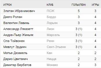 Каррассо (Метц) – Манди (Реймс), Скиллачи (Бастия), Коне (Лорьян), Максвелл (ПСЖ) – Регаттен (Тулуза), Мотта (ПСЖ), Сиприен (Ланс) – Пайе (Марсель), Ибрахимович (ПСЖ), Товен (Марсель)