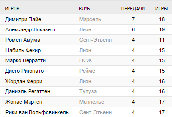 Манданда (Марсель) – Ривьерес (Метц), Мексер (Ренн), Перрен (Сент-Этьенн), Левек (Генгам) – Амума (Сент-Этьенн), Оньянг (Реймс), Гоналон (Лион), Феррейра Карраско (Монако) – Шарбонье (Реймс), Ляказетт (Лион)