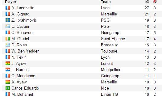 В последнем туре никто из лидирующей группы забивал голами не отметился. Ибрахимович и Ляказетт не играли, а Жиньяк не сумел попрощаться с болельщиками забытым мячом. В итоге лучшим с 27-ю точными ударами стал форвард Лиона Александр Ляказетт, и если не считать чемпионат Испании, то ни в одной из топ-лиг Европы один игрок не забивали такое количество голов.