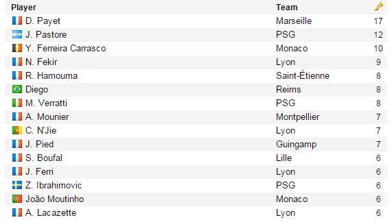 Что касается ассистентов, то лучшим задолго до завершения чемпионата стал форвард Марселя Димитри Пайе. У игрока 17 результативных передач, и некоторые эксперты называют лучшим футболистом сезона Лиги 1 вовсе не Ляказетта, а Пайе. На целых пять ассистов от Димитри отстал нестабильный Хавьер Пасторе, поэтому можно говорить о доминировании представителя Марселя в статистике результативных передач.