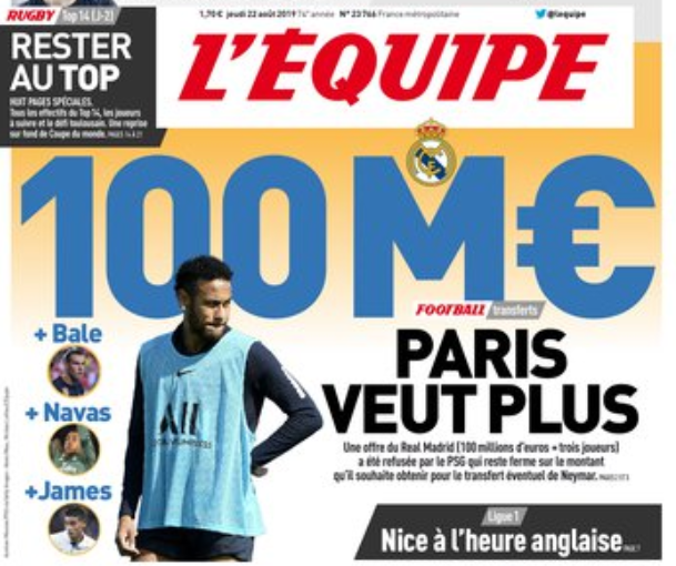 Как сообщает L'equipe, "сливочные" предложили за бразильца 100 миллионов евро, Гарета Бэйла, Хамеса Родригеса и Кейлора Наваса.