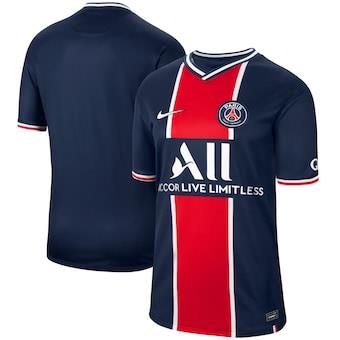 Домашняя форма будет выполнена в традиционных красно-синих цветах ПСЖ, с узором и красной полосой посередине.