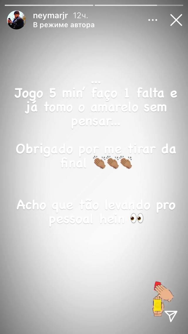 "Я сыграл пять минут, сфолил, после чего мне без раздумий показывают желтую. Спасибо, что лишили меня финала.👏👏👏 Возможно, это что-то личное, а? 👀" — написал Неймар в своем Instagram.