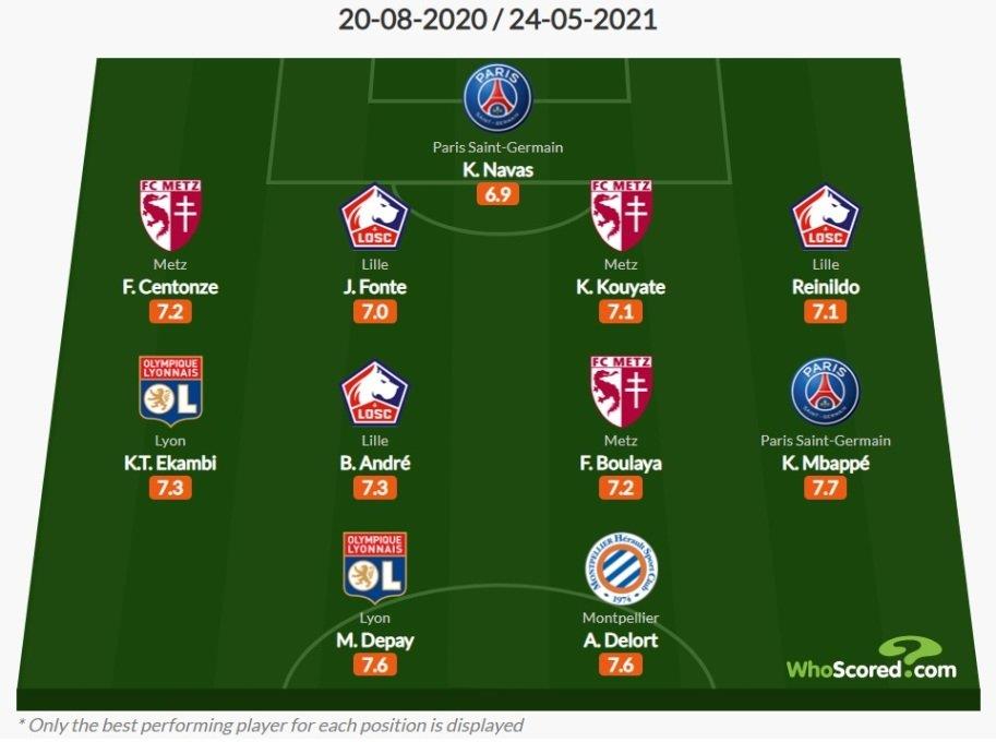 Лучшим футболистом чемпионата Франции стал нападающий ПСЖ Килиан Мбаппе, который получил среднюю оценку в 7,7 балла, ставший лучшим бомбардиром Лиги 1, забив 27 голов в 31 матче.