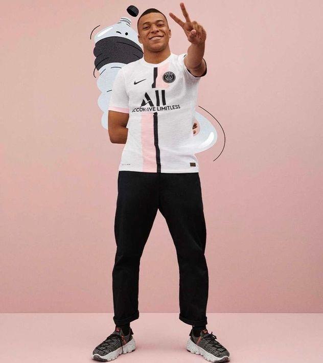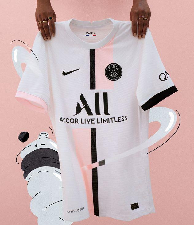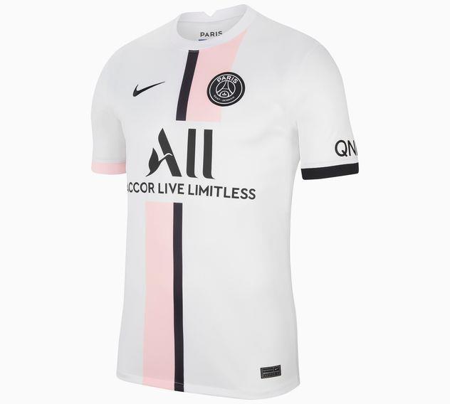 Преимущественно белая выездная футболка ПСЖ дополнена асимметричной полосой черного и розового ("арктик панч") цветов спереди, вдохновленной классической полосой дизайнера Даниэля Хехтера, ранее встречающейся на домашней форме клуба.