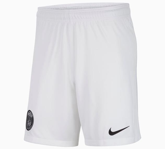 Шорты выездной формы ПСЖ выполнены также в белом цвете с черными логотипами клуба и технического спонсора.