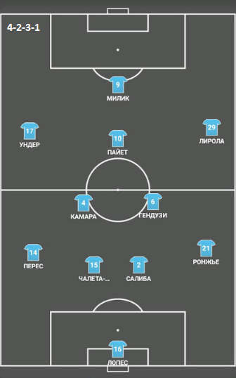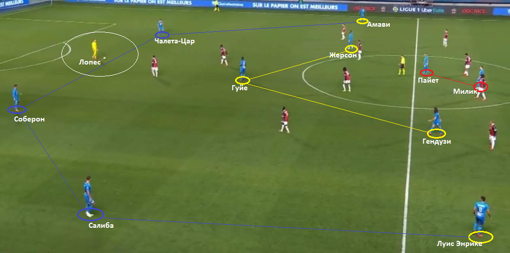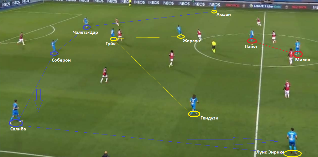В матче с Ниццей Кристофа Гальтье "провансальцы" изначально сыграли с тремя центрбеками. Базовой схемой были 3-5-2 (5-3-2) или 3-5-1-1. Все-таки Пайет часто занимал более низкую позицию, чем Милик. В этом важном поединке Сампаоли был вынужден использовать ротацию. Все-таки противостояние с ПСЖ забрало немало сил.