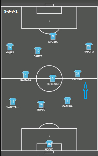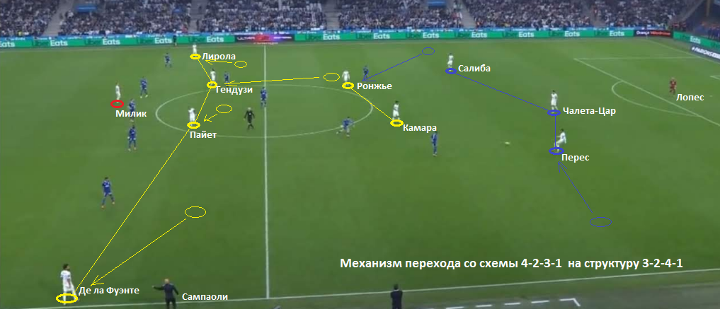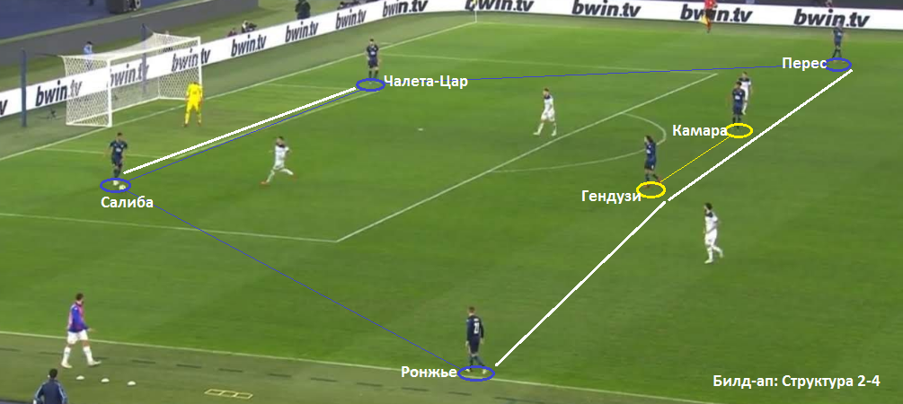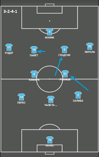 При этом, в чистом виде она просматривается лишь во время первой стадии позиционных атак, когда соперник задействует высокий прессинг и Гендузи опускается в линию к фулбекам и Камара.