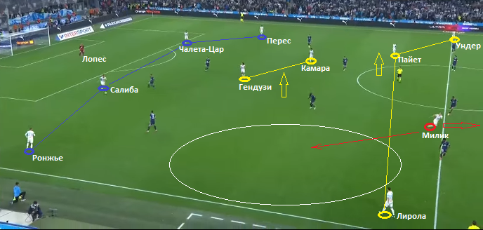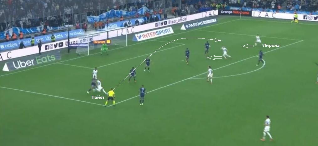 Это достаточно популярный прием в атакующих действиях Марселя. Если в начальных стадиях развития позиционного наступления переводы исполняют защитники или опорные, то при переходе в третью фазу правом обостряющего перевода направо часто пользуется лидер команды. Пайет не только лучший бомбардир и ассистент команды на стартовом отрезке сезона, он наиболее эффективный игрок и в действиях, предшествующих завершающей стадии атак.
