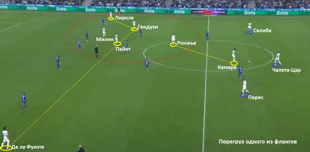 Аналогичным образом перегружается и правый фланг. Если игроки Марселя решают атаковать через перегруженную зону, то численный перевес в зоне мяча и взаимодействий, в случае потери позволяют активировать контрпрессинг.