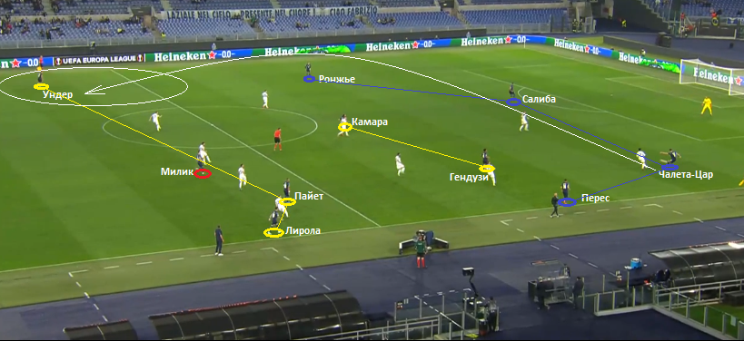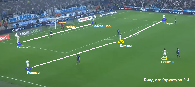 Одной из главных особенностей Марселя в данной фазе игры является смещение одного из опорных и атакующего центрального полузащитника в один из полуфлангов. На наших примерах – это Пайет и Камара. Это позволяет перегрузить одну вертикальную зону, в большинстве случаев – левый фланг/полуфланг, и параллельно открывает векторы и свободные зоны в другой. Если соперник не осуществляет интенсивного давления на защитников и позволяет начинать атаку коротким розыгрышем, у Салиба часто появляется возможность для продвижения мяча длинной передачей в недодачу на игроков группы атаки. Высокая линия обороны оппонента в данном случае предоставляет и вариант прямого заброса за спины защитникам соперника. Часто форвард и вингер делят между собой два потенциальных варианта – атака глубины и открывание в недодачу.