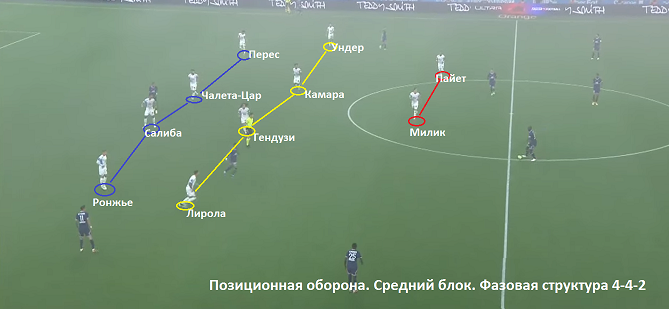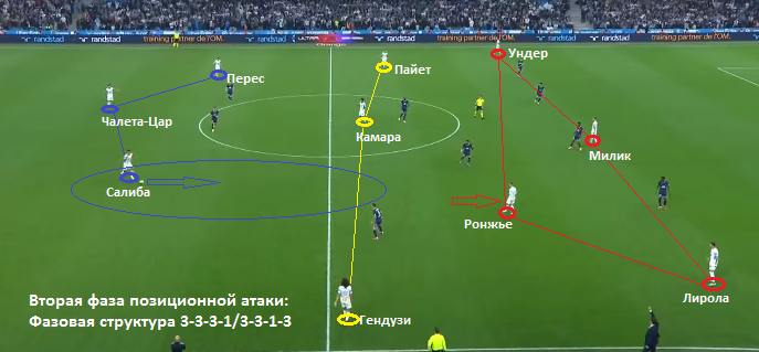 Часто на этой стадии атаки команда может поддерживать структуру 3-4-3 или 3-4-3 с ромбом в центре. Номинальный правый защитник Ронжье в процессе атаки не просто поднимается в линию полузащиты, он смещается в центр и образует пару опорных с Камара.