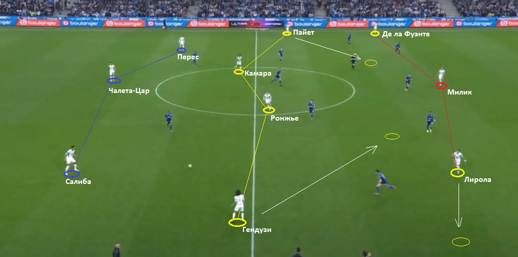 Структура 3-2-4-1 является основной для Марселя в конструктивной фазе игры. Форвард (Милик) и пара атакующих хавбеков (Пайет и Гендузи) обладают серьезной гравитационной силой и гарантированно сужают оборонительный блок оппонентов. Это открывает пространство на флангах, или максимально — на одном фланге, если структура смещена к одной из бровок.