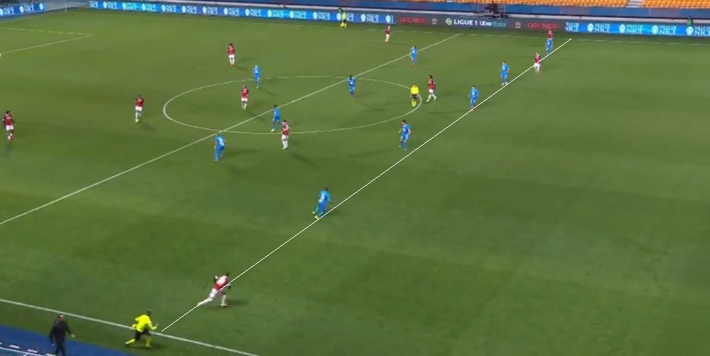 Команда старается поддерживать высокую линию обороны, и вышеупомянутые качества Лопеса очень важны для Марселя. Большую часть матча с Ниццей Олимпик встречал соперника средним блоком, поддерживая структуру 5-3-1-1, но ближе к концу матча команда Сампаоли перешла на 5-4-1. Пайет садился в линию левым полузащитником. Это альтернативная схема Марселя. В подавляющем большинстве случаев "провансальцы" обороняются классическим блоком 4-4-2. Но в случае со скриншотом, схема не имеет принципиального значения. Цель данного снимка – показать положение корпуса у защитников при открытом мяче. Не зависимо от количества игроков в линии, каждый повернут боком, лицом к стороне мяча.