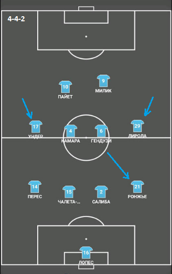 Переход от структуры 3-2-4-1 к схеме 4-4-2 осуществляется за счет возврата Ронжье на позицию правого фулбека и смещений Ундера и Лиролы в линию к хавбекам.