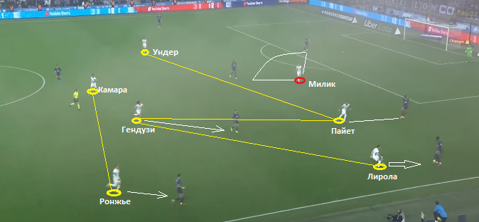 Ронжье заполняет зону, которую ему освобождает Гендузи. В свою очередь, Пайет заранее смещается влево и освобождает зону для Гендузи.