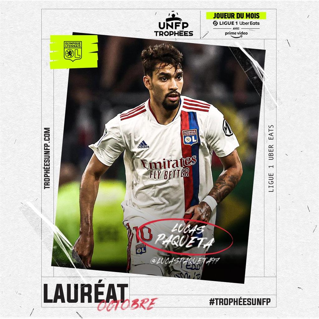 Полузащитник Лиона Лукас Пакета признан лучшим игроком французской Лиги 1 по итогам октября, сообщает UNFP.
