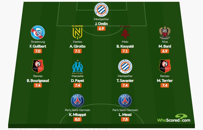 Чемпіонів Ліги 1 – ПСЖ – представляють два нападники – Кіліан Мбаппе та Ліонель Мессі, які отримали найвищі оцінки – 8,0 та 7,8 балів відповідно.
