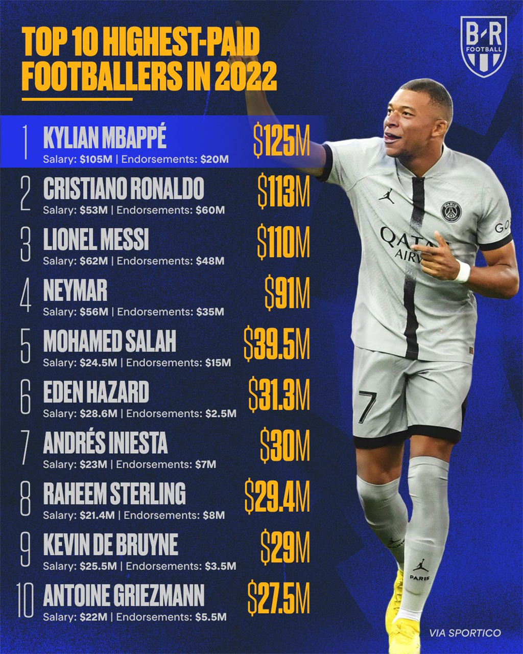 Відчутно відстав від Мбаппе форвард англійського Манчестер Юнайтед Кріштіану Роналду, який отримує в "Червоних дияволах" навіть менше коштів, аніж дає йому реклама — 53 млн євро зарплатні проти 60 млн євро додаткового прибутку.