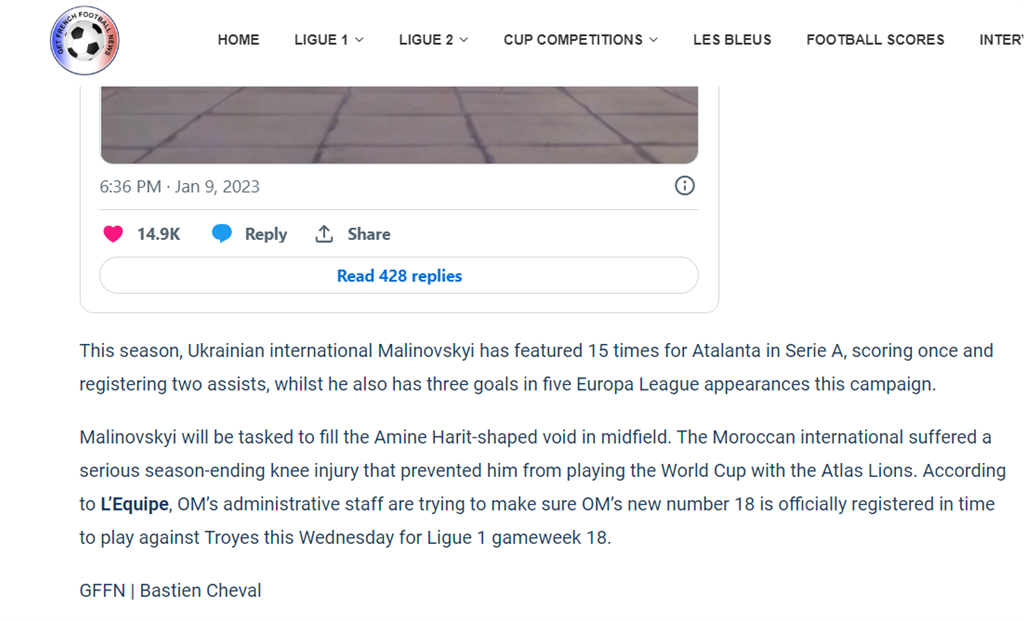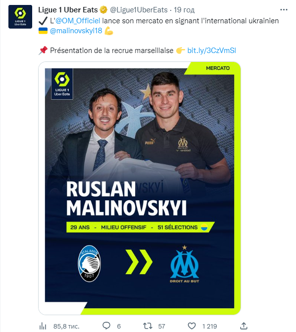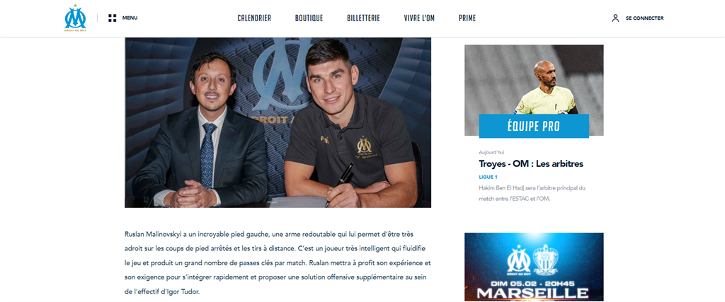 "Марсель відкриває своє трансферне вікно, підписавши гравця збірної України Руслана Маліновського. 29-річний атакувальний півзахисник прибув до Марселя в якості оренди з правом викупу. Уродженець Житомира (Україна) — гравець, який виховувався в донецькому Шахтарі, три з половиною сезони грав в Італії, захищаючи кольори Аталанти, де він провів 143 матчі (30 голів і 24 асисти)".