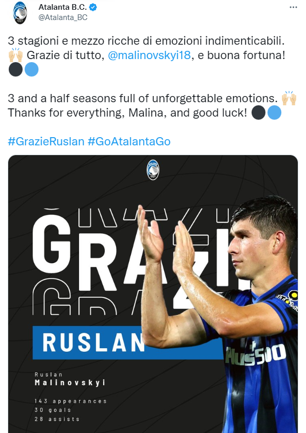 Офіційна пресслужба бергамської Аталанти попрощалася з Маліновським наступним чином: