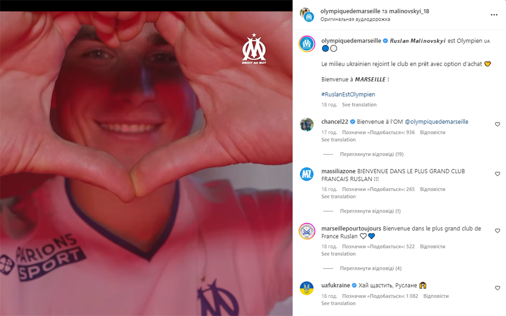 Нашого співвітчизника Марсель представив як справжню зірку. Це не просто слова, адже французький клуб присвятив українцеві окреме відео з презентації та безліч постів у соціальних мережах після фотосесії – і це Маліновський прилетів до Франції лише вчора, 9 січня.