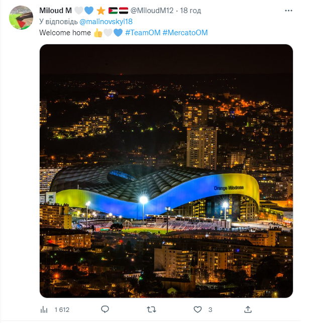 "Ласкаво просимо додому 👍 🤍💙", — написав уболівальник Miloud M, прикріпивши фотографію стадіону Марселя у кольорах українського прапора.