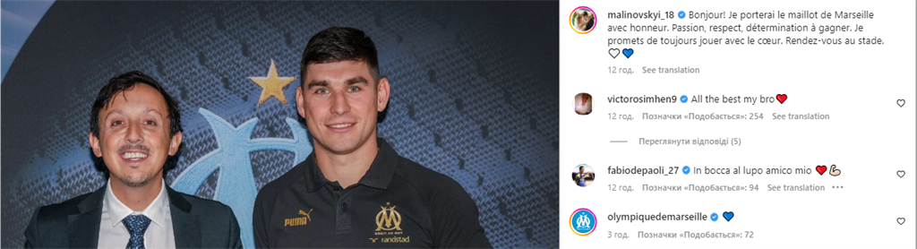 "Вітаю! Я носитиму форму Марселя з честю, пристрастю, повагою та рішучістю. Обіцяю завжди грати від душі. До зустрічі на стадіоні🤍💙", - написав Маліновський французькою мовою в своєму Instagram.