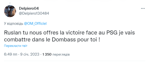 "Руслане, ти приносиш нам перемогу над ПСЖ, а я битимуся за тебе на Донбасі!" — написав фанат Марселя під ніком Delpiero04.