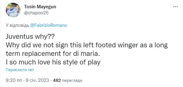 "Ювентусе, чому? Чому ми не підписали цього лівоногого вінгера як довгострокову заміну для Ді Марії? Мені дуже подобається його стиль гри", — написав один з фанатів туринського клубу Tosin Mayegun.