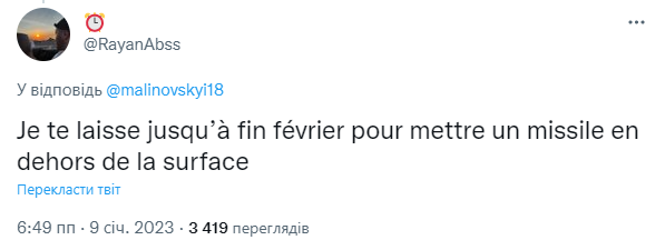 "Я даю тобі час до кінця лютого, щоб вивести свою ракету за межі поверхні", — написав RayanAbss, натякаючи на крутий дальній удар Маліновського.