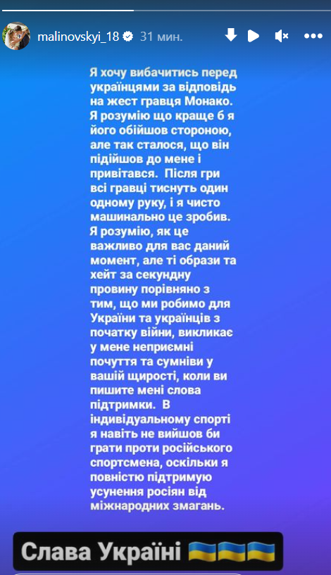 "Я хочу вибачитися перед українцями за відповідь на жест гравця Монако. Я розумію, що краще б я обійшов його стороною, але так сталося, що він підійшов до мене і привітався. Після гри всі гравці тиснуть один одному руку, і я чисто машинально це зробив.