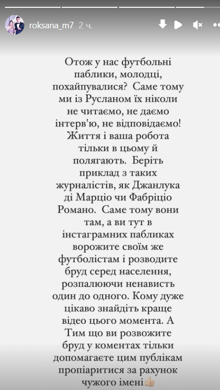 "Отож у нас футбольні пабліки, молодці, похайпувалися? Саме тому ми з Русланом їх ніколи не читаємо, не даємо інтерв'ю, не відповідаємо! Життя й ваша робота тільки в цьому й полягають. Беріть приклад з таких журналістів, як Джанлука Ді Марціо чи Фабріціо Романо.