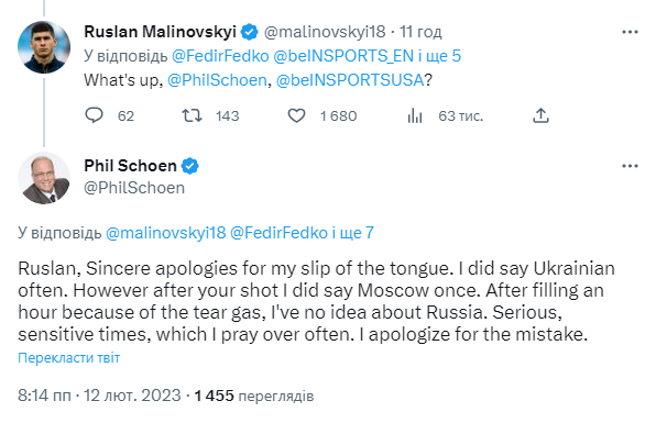 Один із коментаторів Філ Шоен, який працював на цьому матчі, вибачився перед Маліновським у соціальній мережі Twitter, відповівши на пост українця стосовно того, що трапилося.