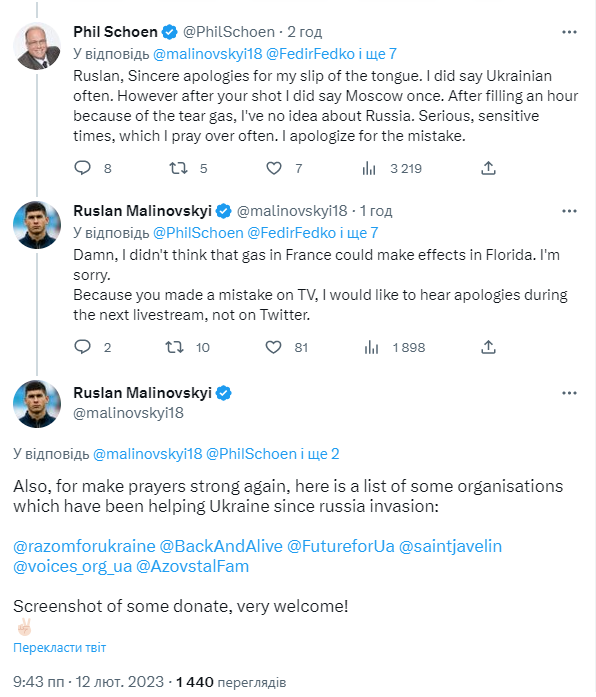 Крім того, щоб знову посилити ваші молитви, ось список деяких організацій, які допомагають Україні з початку вторгнення росії: @razomforukraine, @BackAndAlive, @FutureforUa, @saintjavelin, @voices_org_ua, @AzovstalFam. Скріншот вашого якогось донату тільки вітається!" - відповів Руслан Маліновський в Twitter.