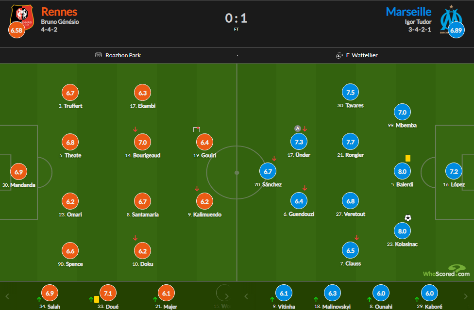 Портал WhoScored оцінив дії Руслана у 6,3. Це, в цілому, низький бал, проте найвищий серед тих, хто вийшов на заміну в Марселя.