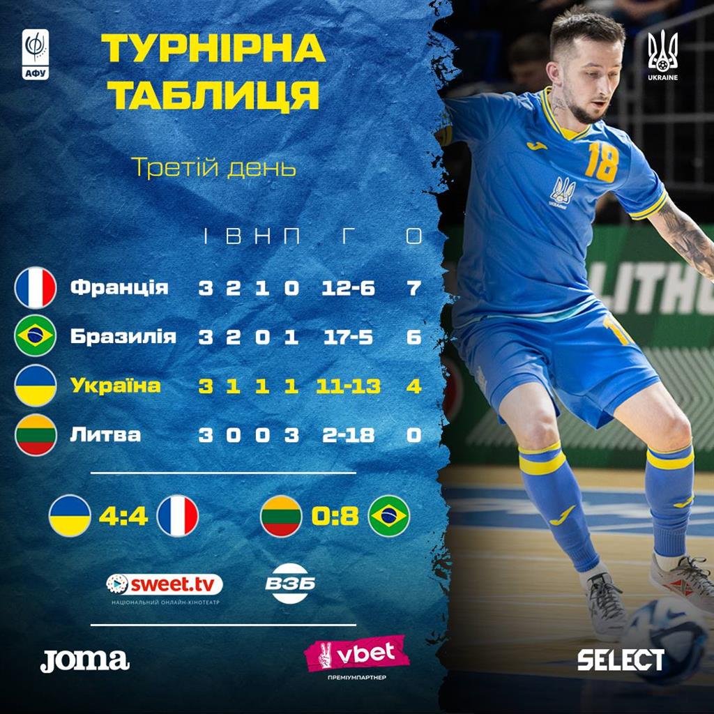 Нагадаємо, раніше Україна в рамках цього турніру поступилася Бразилії (2:7) та без проблем упоралася з Литвою (5:2), а за підсумками всього турніру посіла третє місце в таблиці.
