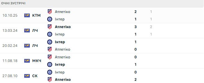 Востаннє Атлетіко офіційно зустрічався з Інтером у плей-оф 2024 року, коли Мадрид у підсумку здобув перемогу в серії пенальті, вигравши матч-відповідь на домашньому полі. Також ще була товариська гра у жовтні цього року — перемога Атлетіко (1:1) в серії пенальті (4:2).