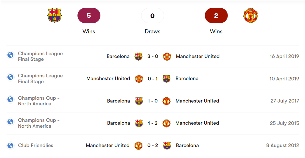 Барселона та Манчестер Юнайтед за всю історію зустрічалися між собою вже 13 разів, і ці матчі, як правило, були незабутніми. До них входять перемоги "синьо-гранатових" у фіналах Ліги чемпіонів 2009 та 2011 років, а також слід згадати про останнє протистояння цих клубів на офіційному рівні, яке пройшло не в рамках головного єврокубку, – фінал Кубка володарів кубків в 1991 році, коли перемогу здобув Манчестер Юнайтед.