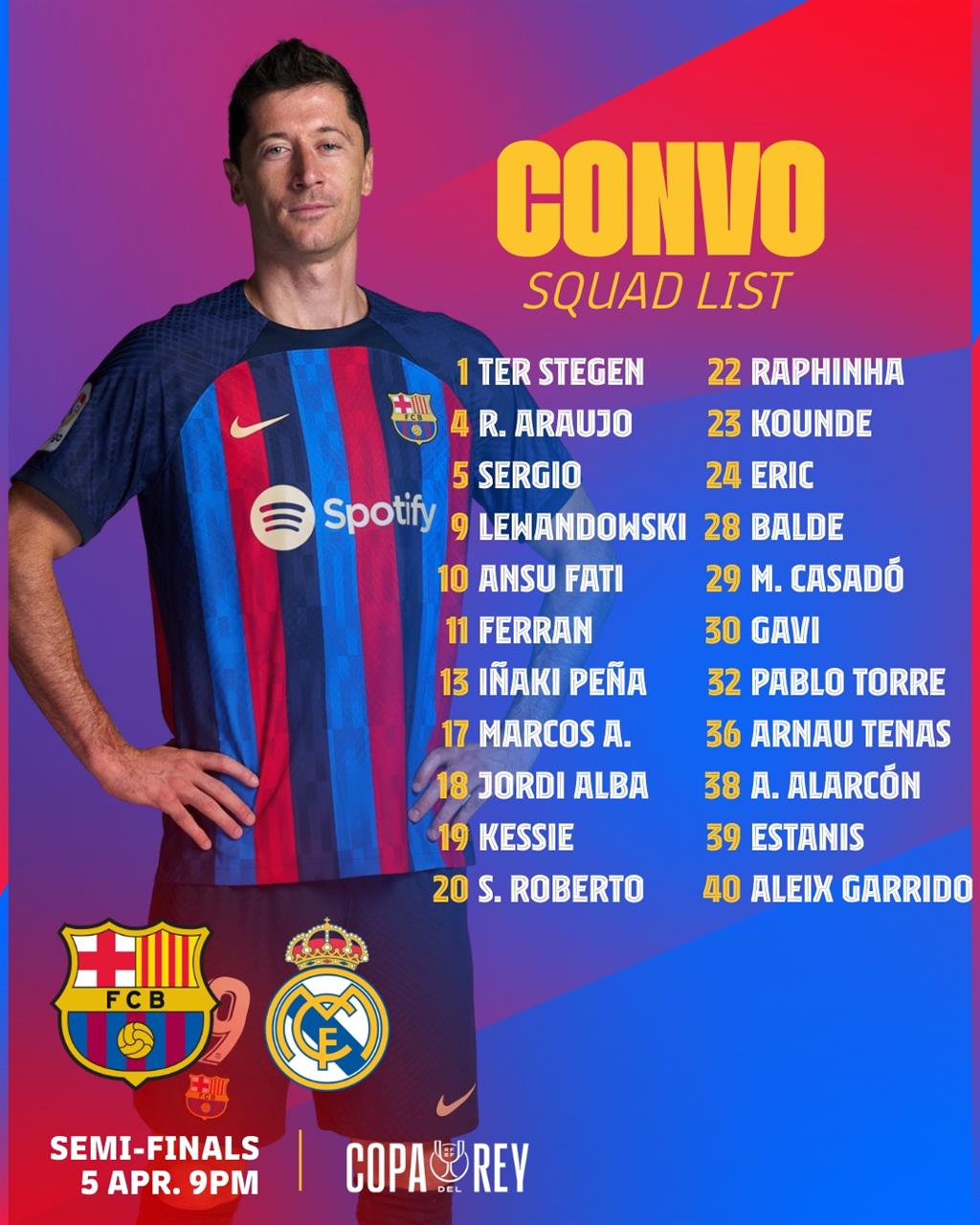 Барселона: тер Штеген — Араухо, Кунде, Алонсо, Бальде — Роберто, Бускетс, Кесс’є — Рафінья, Левандовські, Гаві.