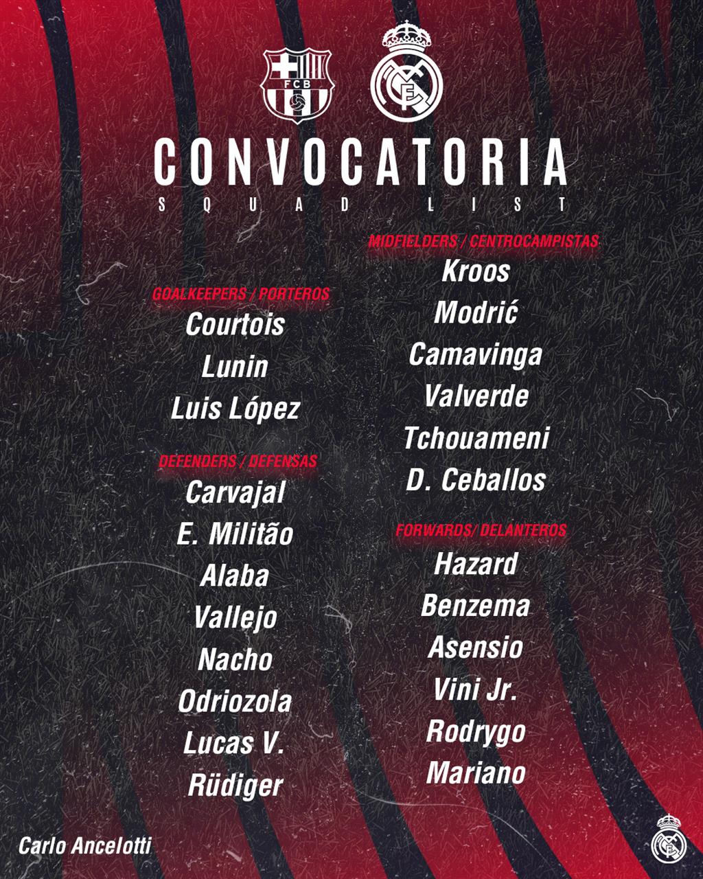 Запасні: Лунін, Лопес, Вальєхо, Начо, Азар, Асенсіо, Одріосола, Васкес, Чуамені, Себальос, Рюдігер, Діас.