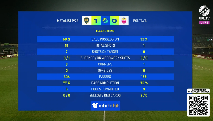 Перерва. 1:0 у нашому матчі за підсумками першої половини.