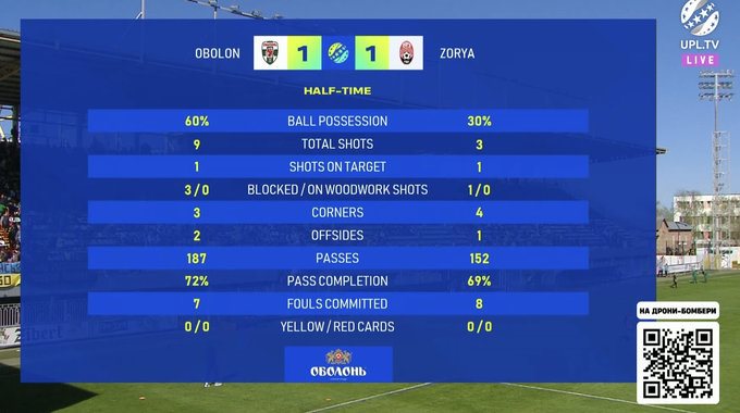 Перерва. 1:1 у нашому матчі за підсумками першої половини.