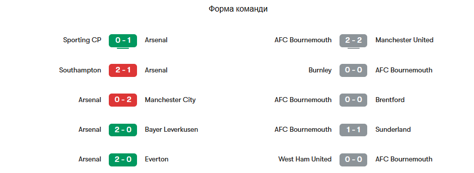 Очікується напружене протистояння: Арсенал прагне втримати чемпіонський темп і може відірватися ще далі, тоді як Борнмут намагатиметься продовжити свою безпрограшну серію. Господарі виглядають фаворитами, але легкого матчу для них точно не буде — особливо з огляду на щільний графік, місцями прагматичний стиль гостей та кадрові втрати "канонірів".