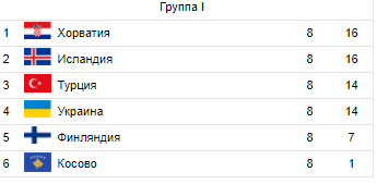 После восьми сыгранных туров турнирная таблица группы I выглядит следующим образом:
