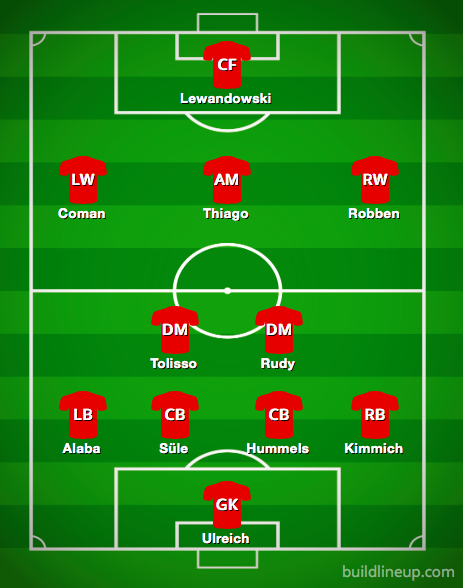 Бавария: Ульрайх - Киммих, Боатенг, Хуммельс, Алаба - Руды, Мартинес - Роббен, Алькантара, Родригес - Левандовски
