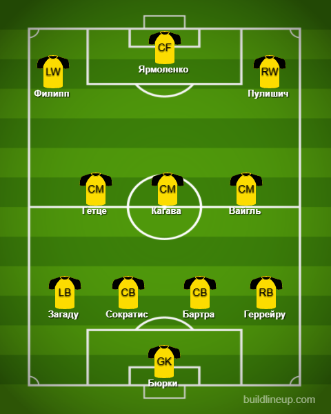 Боруссия Д: Бюрки — Тольян, Папастатопулос (Загаду, 46), Бартра, Шмельцер — Гётце, Вайгль, Кагава (Дауд, 63) — Филипп, Ярмоленко, Шюррле (Геррейру, 83)