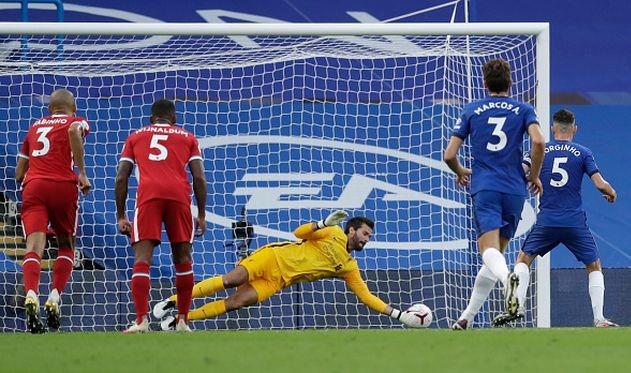 АЛИССОН! Вратарь Ливерпуля потащил удар Жоржиньо с пенальти.